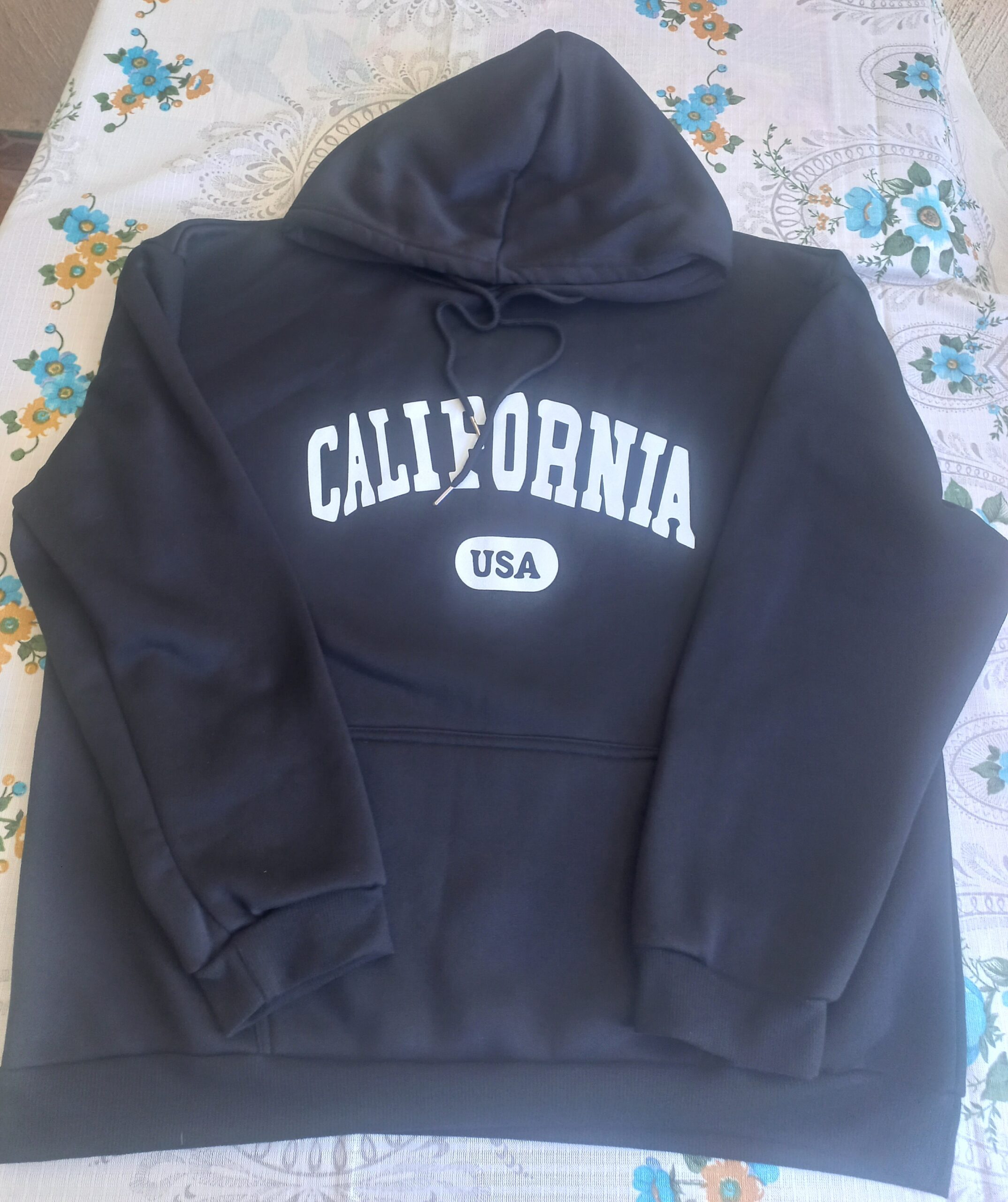 Sudadera negra con capucha, estampado urbano «California», estilo casual. 😎